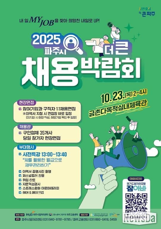 뉴스다 최광묵 기자 | 파주시는 오는 10월 23일 금촌다목적실내체육관 2층에서 ‘2025년 파주시 더 큰 채용박람회’를 개최한다고 밝혔다. 이에 앞서 행사에 참여할 구직자를 10월 1일부터 17일까지 모집한다.