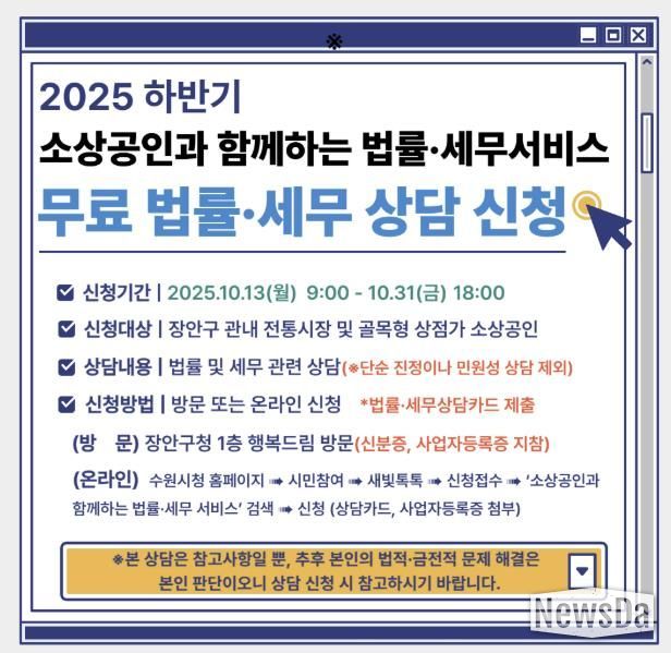뉴스다 최광묵 기자 | 수원시 장안구는 오는 10월 13일부터 법률·세무 상담을 받기 어려운 관내 전통시장 및 골목형 상점가 소상공인을 대상으로 쉽고 편리하게 상의할 수 있는 무료 상담인 ‘소상공인과 함께하는 법률·세무 서비스’ 사업을 운영한다.