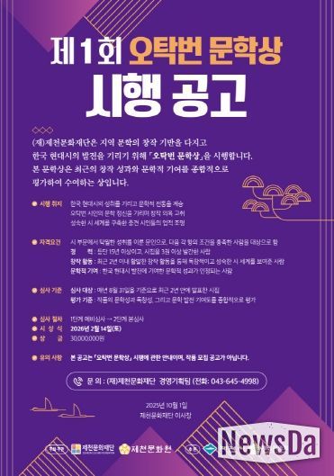 뉴스다 최광묵 기자 | (재)제천문화재단(이사장 김상수)은 지역 문학의 창작 기반을 다지고 한국 현대시의 발전을 기리기 위해 제천문화재단 제1회'오탁번 문학상'을 공고했다. 이번 문학상은 최근의 창작 성과와 문학적 기여를 종합적으로 평가하여 수여하는 상으로, 오탁번 시인의 문학 정신을 기리고 문학적 전통을 계승하는데 그 취지가 있다.
