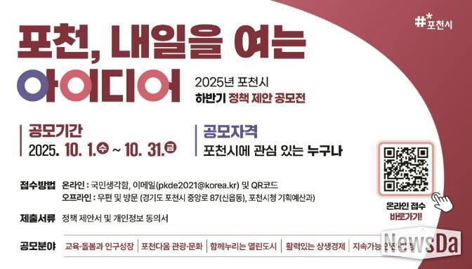 포천시 관계자는 “이번 정책 제안 공모전은 시민이 시정의 주체로 직접 참여하는 뜻깊은 기회”라며, “작은 아이디어 하나가 포천의 미래를 바꾸는 씨앗이 될 수 있는 만큼, 많은 시민들의 적극적인 참여를 바란다”고 말했다.