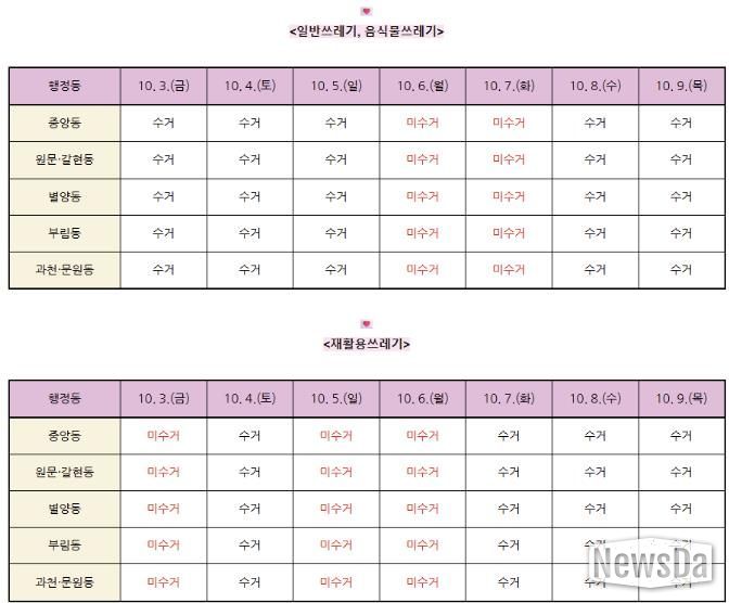 생활폐기물 수거는 일반 쓰레기의 경우 3일, 4일, 5일, 8일, 9일에, 재활용 쓰레기는 4일, 7일, 8일, 9일에 각각 수거된다.
