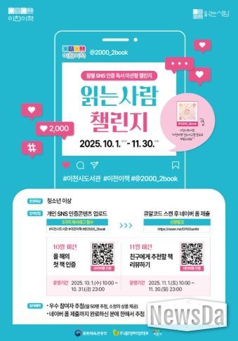 뉴스다 최광묵 기자 | 이천시는 2025 독서기반 지역 활성화 공모 사업의 일환으로 이천이책 사회관계망(SNS) 인증 독서 미션형 챌린지인 ‘읽는 사람 챌린지’를 오는 10월 1일부터 11월 30일까지 두 달간 운영한다.
