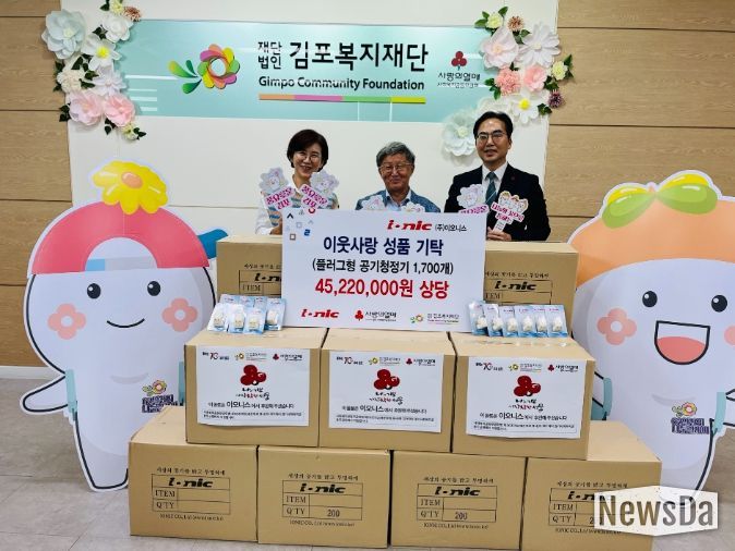 뉴스다 최광묵 기자 | 공기청정기 전문 제조업체인 ㈜이오니스가 관내 어르신들의 건강한 생활환경을 위해 플러그형 공기청정기 1,700대, 45,220,000원 상당을 김포복지재단에 기탁했다.