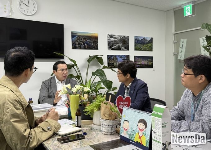 뉴스다 최광묵 기자 | 경기도의회 농정해양위원회 이오수 의원(국민의힘, 수원9)은 1일 경기도의회 의원실에서 광교신도시 개발이익금의 합리적이고 투명한 활용 방안을 논의하기 위해 수원특례시 도시개발국 도시개발과 관계자들과 간담회를 가졌다.