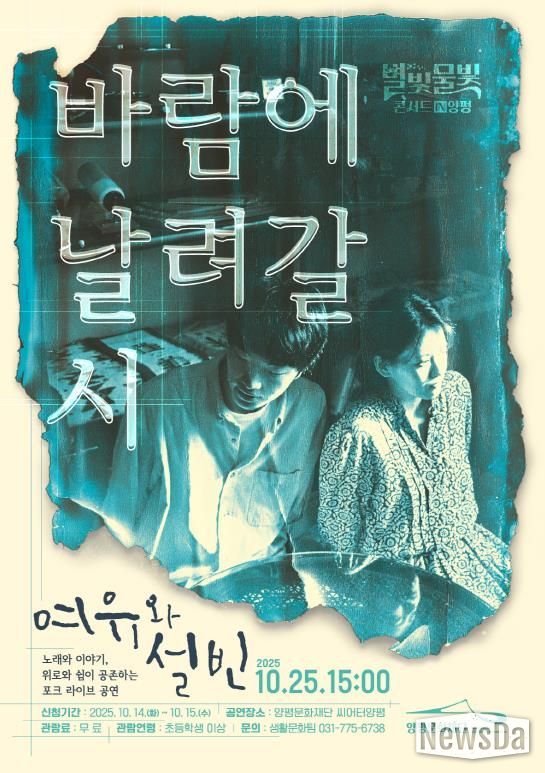 뉴스다 최광묵 기자 | 양평문화재단은 오는 10월 25일 오후 3시, 양평문화재단 2층 씨어터양평에서 ‘별빛물빛 콘서트 in 양평’ 10월 정기 공연으로 인디 듀오 여유와 설빈의 '바람에 날려갈 시'를 선보인다.