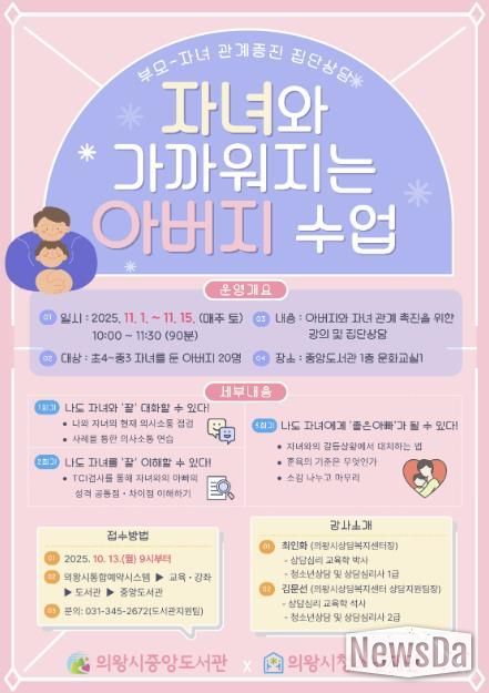 뉴스다 최광묵 기자 | 의왕시 중앙도서관은 사춘기 자녀와의 관계에서 어려움을 겪고 있는 아버지를 위한 부모 집단상담 프로그램 ‘자녀와 가까워지는 아버지 수업’을 운영한다.