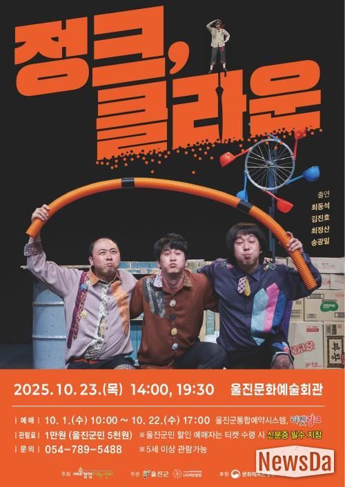 뉴스다 최광묵 기자 | 울진군은 오는 10월 23일 오후 14시, 19시 30분, 울진문화예술회관에서 2025 공연예술 유통 지원사업에 선정된 코믹 마임극‘정크, 클라운’공연을 두차례 선보인다.