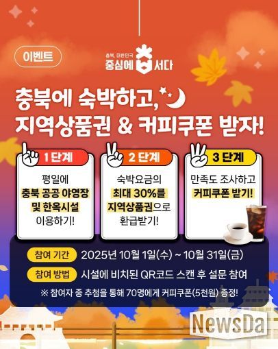 장인수 충북도 관광과장은 “평일 숙박 환급 지원과 만족도 조사를 연계해 관광객들의 참여를 높이고, 의견을 나눌 수 있는 기회를 마련했다.”며, “많은 분들이 충북에서 머무르면서 혜택도 누리고 선물도 받을 수 있는 이번 조사에 많은 분들의 관심과 참여를 부탁드린다”고 말했다.