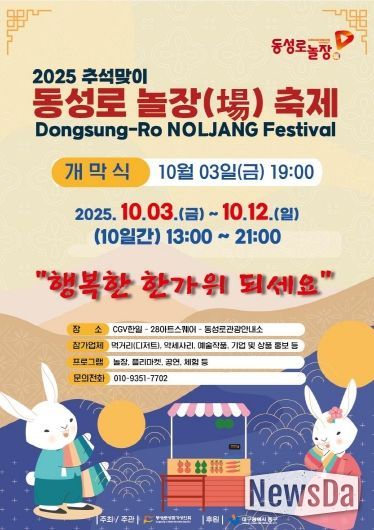 뉴스다 최광묵 기자 | 대구 중구는 10월 3일부터 12일까지 10일간 동성로 보행자전용도로 일원에서 ‘동성로에서 놀며 장보자!’라는 테마로 ‘2025 추석맞이 동성로 놀장(場) 축제’를 개최한다.