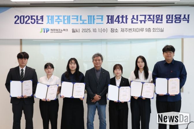 뉴스다 최광묵 기자 | 제주테크노파크(원장 지영흔, 제주TP)가 1일 제주벤처마루 9층 회의실에서 6명의 신규직원에게 임명장을 수여했다.