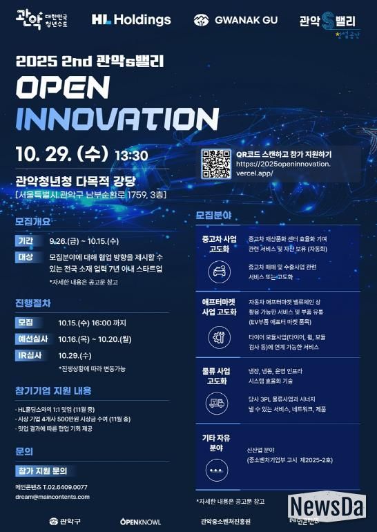 뉴스다 최광묵 기자 | 관악구가 자동차, 물류 분야 글로벌 네트워크를 보유한 ‘HL홀딩스’와 함께 ‘2025 제2회 관악S밸리 오픈 이노베이션’에 참가할 기업을 모집한다.