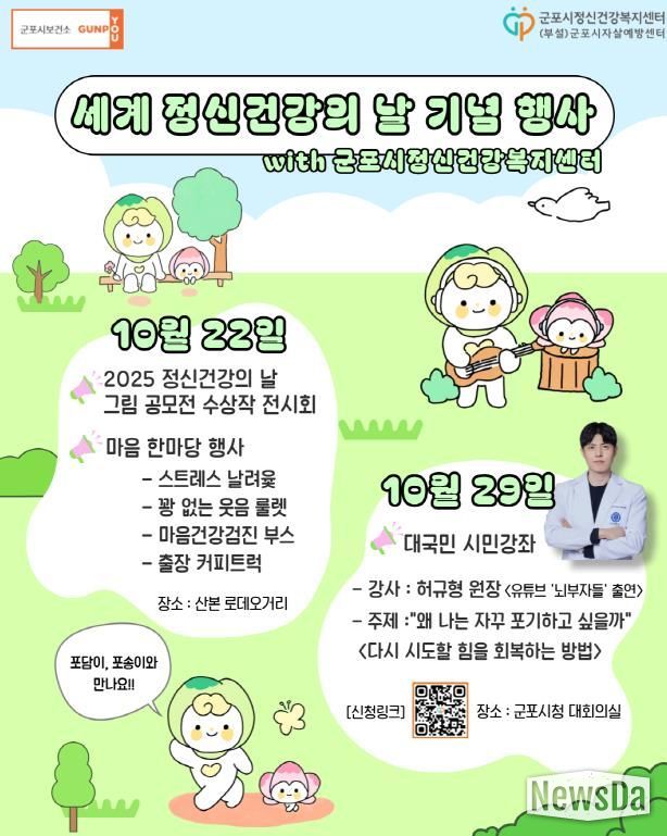뉴스다 최광묵 기자 | 군포시정신건강복지센터 부설 군포시자살예방센터는 오는 10월 10일 세계 정신건강의 날을 맞이해 정신건강을 위한 다양한 행사를 개최할 예정이다.