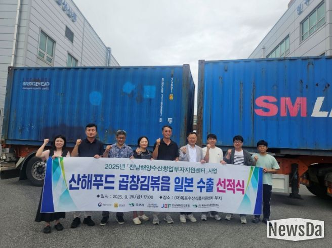 뉴스다 최광묵 기자 | (재)목포수산식품지원센터는 9월 26일, 전남해양수산창업투자지원센터 사업 수혜기업인 산해푸드(대표 오시윤)가 일본 바이어와 체결한 2만3천 달러(한화 약 3천2백만 원) 규모의 곱창김 제품 수출 계약에 따라 센터에서 선적식을 개최했다고 밝혔다.