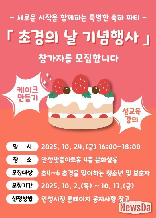 안성시 관계자는 “다가오는 행사가 또래 친구들과 함께 초경을 축하하고 경험을 나누는 소통과 공감의 장이 되길 바란다”며, “이를 통해 초경에 대한 긍정적 인식이 확산되는 계기가 되기를 기대한다”고 전했다.