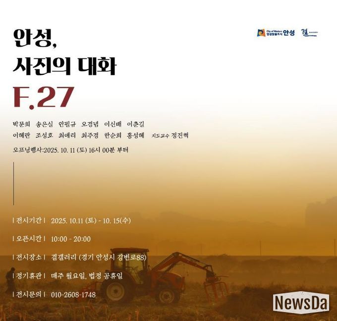 뉴스다 최광묵 기자 | 안성시 사진동아리 F.27 photo가 오는 10월 11일부터 15일까지 안성천 작은미술관 결갤러리에서 전시회 ‘안성, 사진의 대화 F.27’을 개최한다. 이번 전시는 동아리 회원 18명이 참여해 안성의 자연환경과 사람들의 이야기를 기록한 작품을 선보인다.