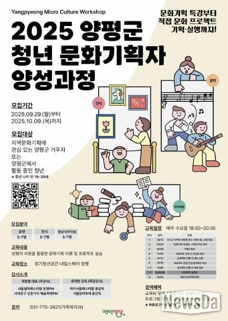 뉴스다 최광묵 기자 | 양평군은 청년들의 문화·예술 기획 역량 강화를 통해 지역사회 문화 활성화와 청년 일자리 창출을 지원하고자 ‘2025년 양평군 청년 문화기획자 양성과정’을 10월부터 12월까지 운영한다고 밝혔다.