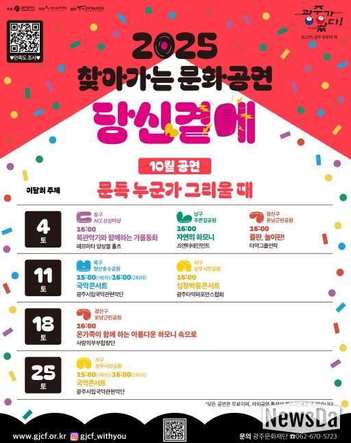 뉴스다 최광묵 기자 | 광주문화재단 ‘찾아가는 문화공연 '당신곁에'’ 10월 공연이 오는 4일부터 본격 시작한다.