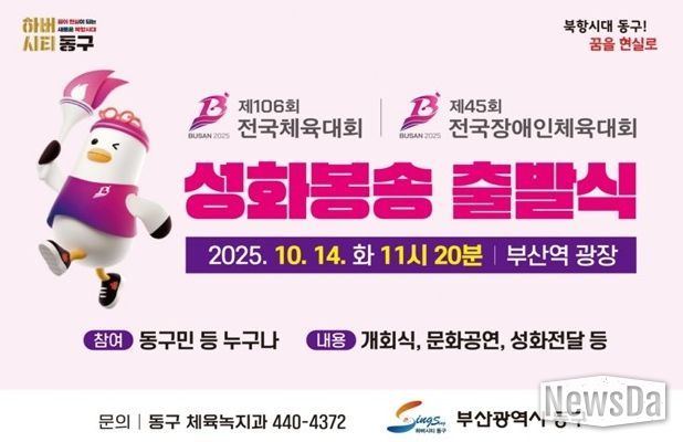 뉴스다 류대현 기자 | 부산동구는 오는 10월 14일, 제106회 전국체육대회 및 제45회 전국장애인체육대회의 성공적인 개최를 기원하고 대회의 시작을 알리는 성화봉송 출발식행사를 개최한다고 밝혔다.