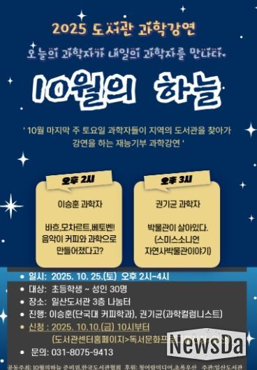 뉴스다 최광묵 기자 | 고양특례시 일산도서관에서는 과학자들의 재능기부 도서관 과학 강연프로그램 ‘10월의 하늘’을 운영한다.