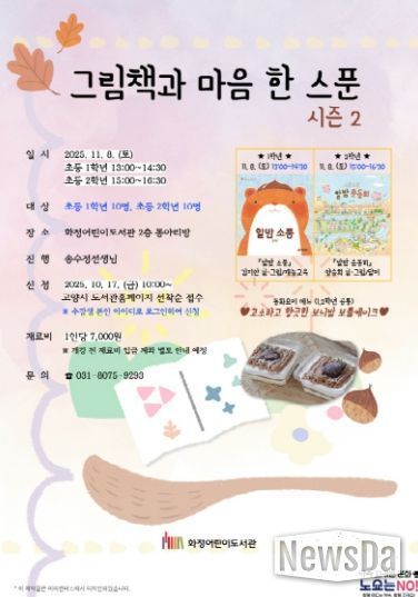 뉴스다 최광묵 기자 | 고양특례시 화정어린이도서관은 오는 11월 8일 ‘고소하고 향긋한 보늬밤 보틀케이크’를 만들어보는 그림책 동화요리 프로그램‘그림책과 마음 한 스푼-시즌2’를 운영한다.