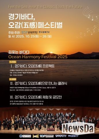 뉴스다 최광묵 기자 | (재)김포문화재단은 오는 10월 25일부터 26일까지 양일간 김포 아라마리나 문화광장에서 'Ocean Harmony Festival 2025, 경기바다 오감(五感) 페스티벌'을 개최한다고 밝혔다. 이번 행사는 한국경제TV 및 한경arteTV가 주관하고 경기관광공사가 후원한다.