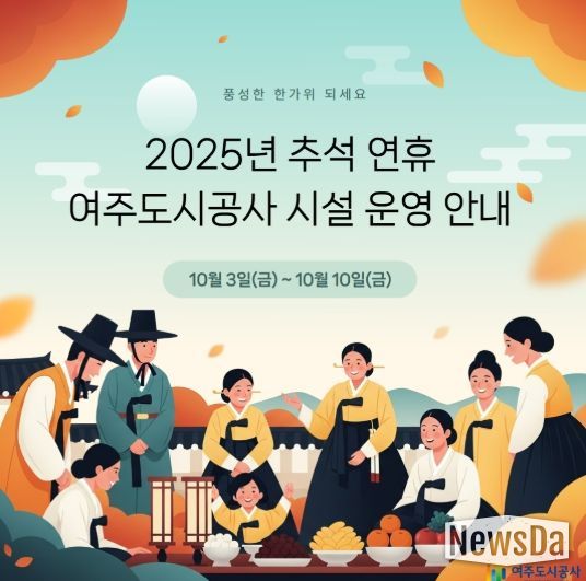 뉴스다 최광묵 기자 | 여주도시공사는 2025년 추석 명절을 맞아 고향을 찾는 귀성객과 시민들의 편의를 위해 주요 시설 운영시간 조정, 무료개방 등 특별 서비스를 제공한다고 2일 밝혔다.