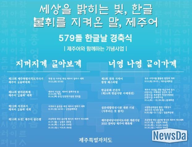 뉴스다 최광묵 기자 | 제주특별자치도는 훈민정음 반포 579돌 한글날을 맞이해 오는 9일 오전 10시 제주문예회관에서 한글날 경축식을 개최한다.