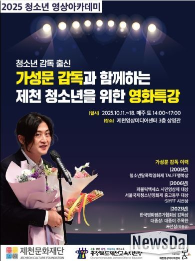 뉴스다 최광묵 기자 | 제천문화재단은 오는 11일과 18일 오후 2시 제천영상미디어센터 봄에서 ‘청소년 영상아카데미’교육생을 대상으로 가성문 감독과 함께하는 청소년 영화특강을 개최한다고 밝혔다.