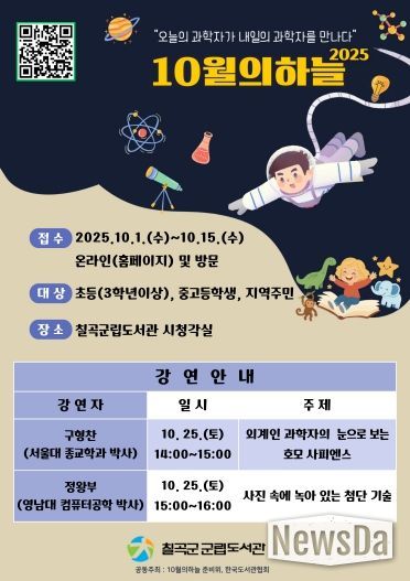 뉴스다 최광묵 기자 | 칠곡군립도서관은 한국도서관협회와 10월의 하늘 준비위원회가 공동 주최하는『10월의 하늘: 과학자들의 재능기부 도서관 과학 강연』공모사업에 선정되어 오는 25일 오후 2시에 강연을 개최한다.