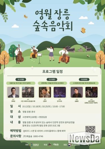 뉴스다 최광묵 기자 | 영월군은 오는 10월 12일, 18일, 25일 오후 3시부터 5시까지 세계유산 장릉 경내에서 ‘영월 장릉 숲속 음악회’를 개최한다.