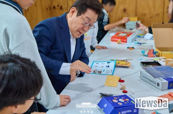 이어 명절을 맞아 딱지, 팽이 등 전통 장난감 만들기 체험을 하고 있던 아이들을 만난 이재명 대통령은 아이들과 일일이 하이파이브를 하며 인사를 나누고, 놀이를 함께했다.