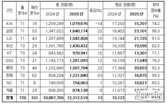 최종적으로 2025시즌은 지난 시즌 보다 약 13% 증가한 1,231만 2,519명의 관중이 입장하며 평균 관중 1만 7,101명을 기록했다. 전체 경기 수의 약 46%인 331경기가 매진됐고, 좌석 점유율 또한 82.9%를 기록했다.