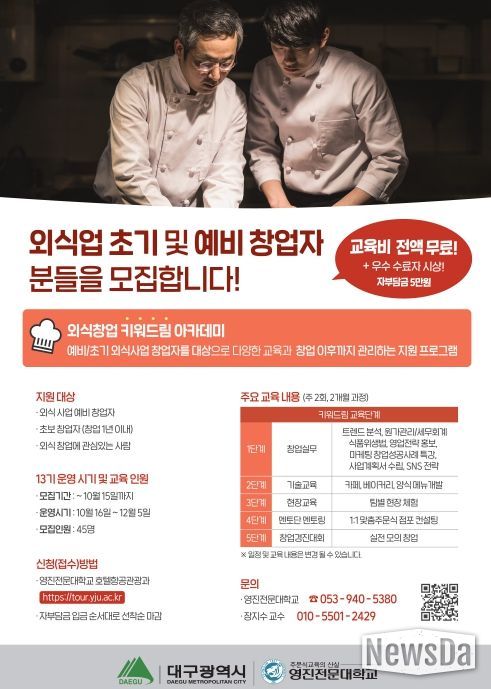 뉴스다 최광묵 기자 | 대구광역시는 외식업 예비창업자와 초기 창업자의 안정적 정착을 지원하기 위해 외식창업 ‘키워드림’ 아카데미 13기 참가자를 10월 15일까지 모집한다.