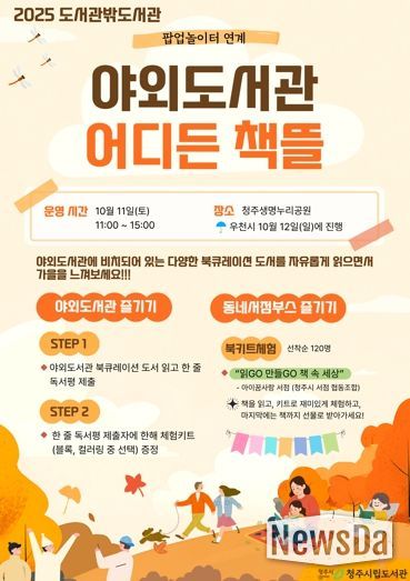 뉴스다 최광묵 기자 | 청주시립도서관은 오는 11일 오전 11시부터 오후 3시까지 생명누리공원 일원에서 2025년 팝업놀이터와 연계해 ‘도서관밖도서관’을 운영한다.