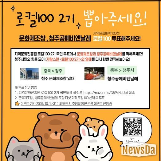 문화체육관광부와 지역문화진흥원이 진행하는 이번 투표는 지역 대표 문화자원을 국민과 함께 발굴하고 확산하기 위한 것으로, 청주공예비엔날레와 문화제조창은 2023년 제1기 로컬100으로 선정된 데 이어 이번 2기 후보군에도 이름을 올렸다.