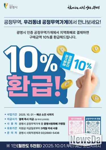 뉴스다 최광묵 기자 | 광명시가 공정무역가게에서 광명사랑화폐(지역화폐)로 결제하면 결제금액의 10%를 돌려주는 ‘공정무역 실천 캐시백’ 행사를 진행한다고 9일 밝혔다.