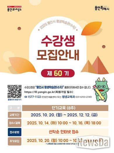 뉴스다 최광묵 기자 | 용인특례시는 14일부터 16일까지 수지에 위치한 용인시 평생학습관에서 진행되는 ‘제60기 단기(8주) 교육 프로그램’ 수강생을 모집한다고 9일 밝혔다.