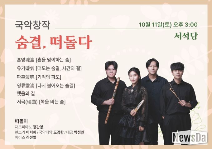 사람은 태어나고, 관계를 맺으며 살아가고, 언젠가 떠난다. 그러나 떠난다고 해서 모든 것이 사라지는 것은 아니다. 우리가 남긴 기억과 흔적은 주변 사람들의 마음속에서 순환하며, 삶과 죽음의 경계를 허문다. 퓨전국악 단체 떠돌이의 '숨결, 떠돌다'는 만남과 이별, 떠돎과 순환이라는 삶의 본질을 음악으로 풀어낸 무대다. 한국 전통 음악의 뿌리를 기반으로 하면서도 현대적 감각을 더한 이 공연은, 익숙하면서도 새로운 음악적 경험을 통해 생과 사의 의미를 되새기는 시간을 선사한다.