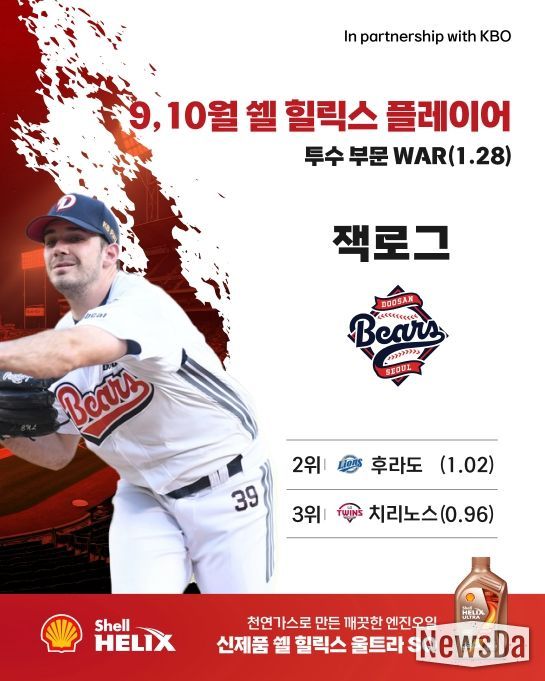 ‘쉘힐릭스플레이어’는 WAR(대체 선수 대비 승리 기여도)를 기준으로 선정하며, 9-10월 투수 부문에서는 두산 잭로그가 WAR 1.28로 1위를 차지했다. 잭로그는 9-10월 동안 총 25이닝(공동 6위)을 소화하며 평균자책점 1.08(1위), WHIP 0.92(4위)를 기록했다. 삼진 또한 27개(공동 7위) 잡아내는 등 안정적인 경기 운영과 강력한 구위를 선보이며 올 시즌 마지막 ‘쉘힐릭스플레이어’ 투수 부문 수상의 영예를 안았다.