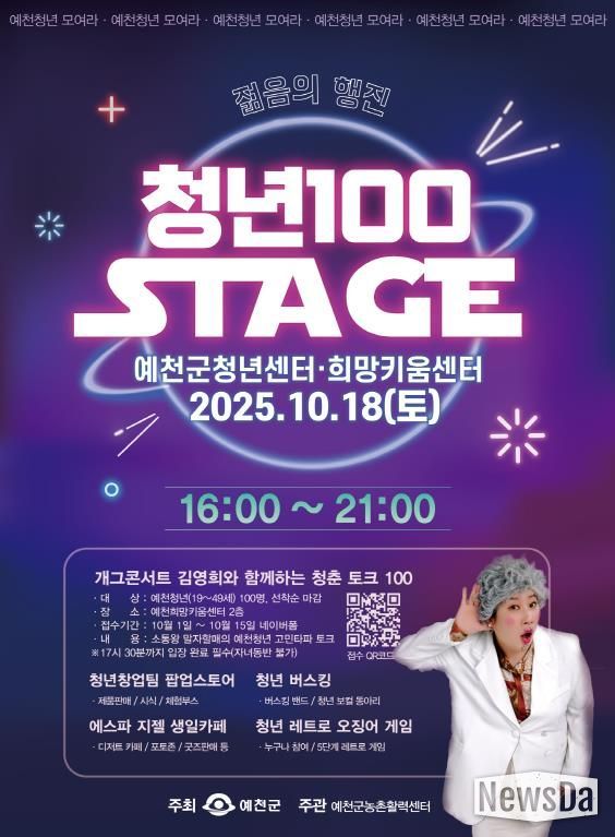 뉴스다 최광묵 기자 | 예천군은 오는 18일, 예천읍 청년센터와 희망키움센터 일원에서 청년들을 위한 문화행사 ‘청년 100 스테이지’를 개최한다.
