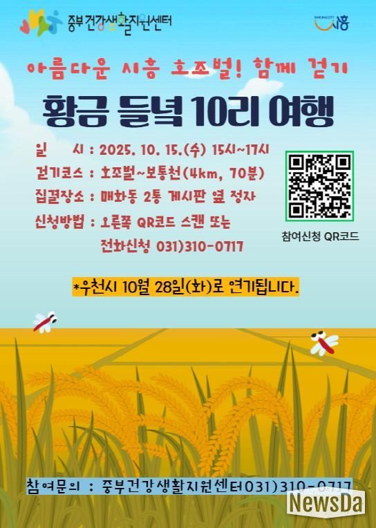 뉴스다 최광묵 기자 | 시흥시는 오는 10월 15일 오후 3시부터 5시까지 호조벌 일대에서 ‘황금 들녘 10리 여행 걷기 행사’를 연다.