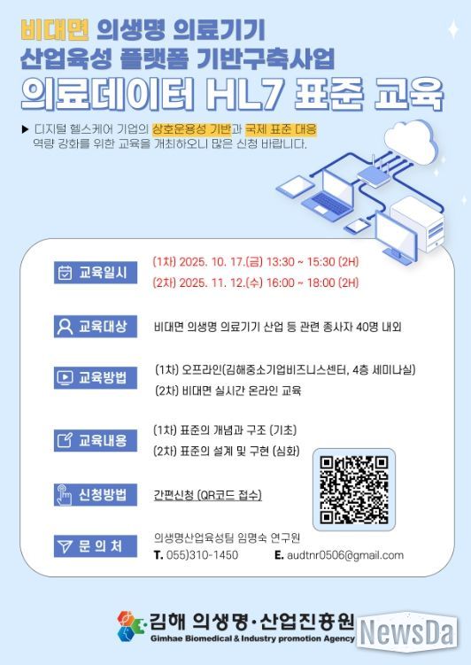 뉴스다 최광묵 기자 | 김해의생명·산업진흥원은 HL7 Korea와 지난해 7월 5일 체결한 '상호운용성시험 협력체계 구축 업무협약(MOU)'의 후속 조치로, 전국 비대면 의료기기 및 디지털 헬스케어 관련 종사자를 대상으로 ‘의료데이터 HL7 표준 교육 프로그램’을 10월부터 본격 운영한다고 밝혔다.