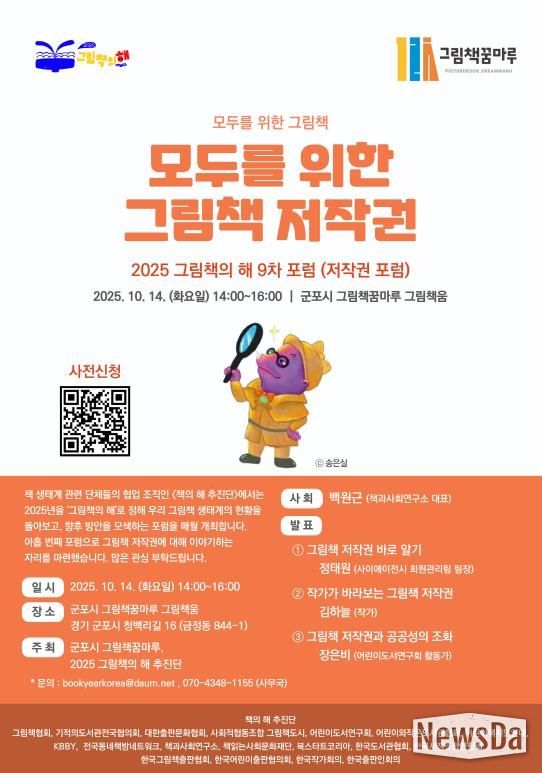 군포시 그림책꿈마루와 2025년 그림책의 해 추진단이 공동 주최하고 백원근 책과사회연구소 대표의 사회로 진행되는 이번 포럼은 ‘모두를 위한 그림책 저작권’이라는 주제로 전문가, 작가, 시민들이 함께 참여하여 그림책 저작권 침해사례와 저작권 보호 및 인식개선방안에 대하여 심도있는 논의를 할 예정이다.