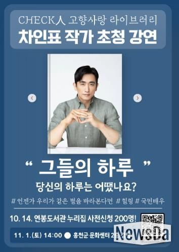 뉴스다 최광묵 기자 | 홍천군립도서관은 11월 1일 오후 2시 홍천군 문화센터 2층 강당에서 차인표 작가를 초청하여 체크인 고향사랑 라이브러리 마지막 강연을 개최한다.