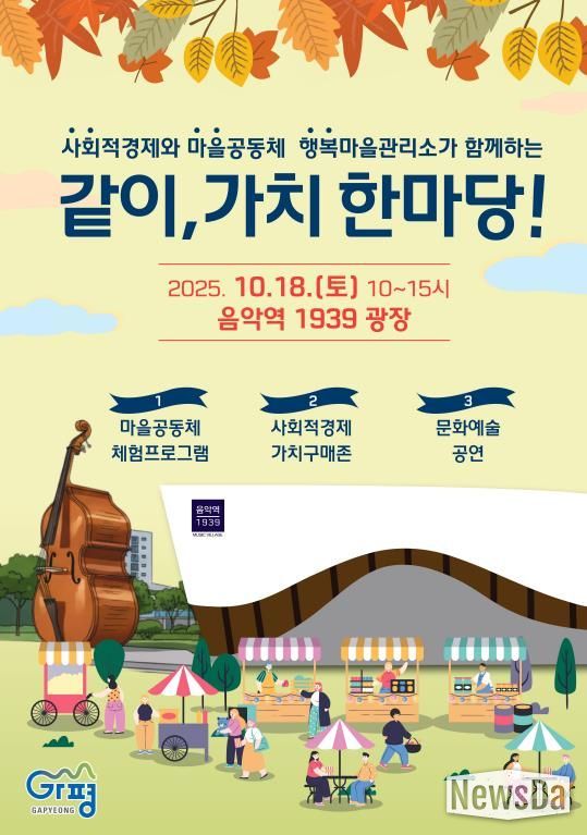 뉴스다 최광묵 기자 | 가평군은 오는 18일 오전 10시부터 오후 3시까지 음악역 1939 광장에서 주민과 함께하는 축제 ‘2025년 같이, 가치 한마당’을 연다.