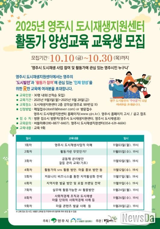 뉴스다 최광묵 기자 | 영주시 도시재생지원센터는 영주시 도시재생사업에 관심 있는 시민을 대상으로 ‘2025년 활동가 양성과정 교육’ 수강생을 10월 10일부터 30일까지 모집한다.