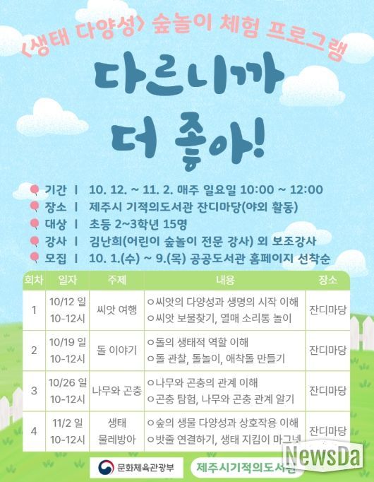 뉴스다 최광묵 기자 | 제주시 기적의도서관은 ‘2025년 다문화 서비스 지원사업’의 일환으로 10월 프로그램인 ‘생태 다양성: 다르니까 더 좋아!’와 ‘문화 다양성: 달라서 좋아, 함께해서 좋아!’를 운영한다.
