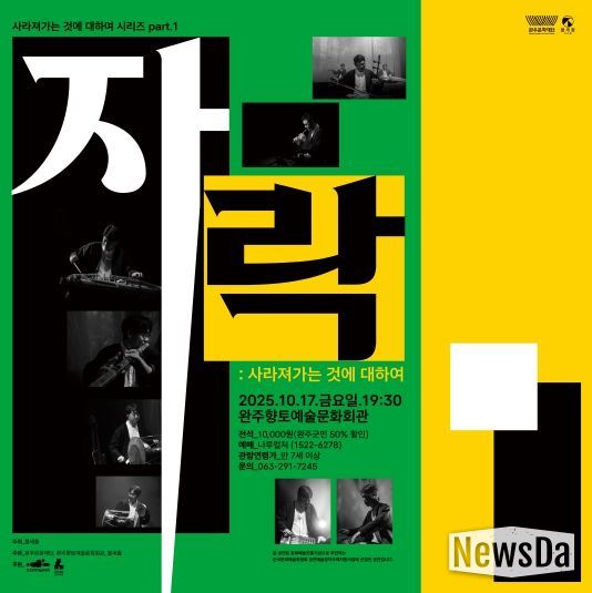 뉴스다 최광묵 기자 | 전북 완주군에 깊어가는 가을밤, 사라져가는 토속 민요의 숨결을 현대적인 감각으로 재조명하고 재해석한 특별한 국악 공연이 펼쳐진다. 완주문화재단은 오는 10월 17일, 완주향토예술문화회관에서 국악앙상블 불세출의 '자락: 사라져가는 것에 대하여' 공연을 개최한다