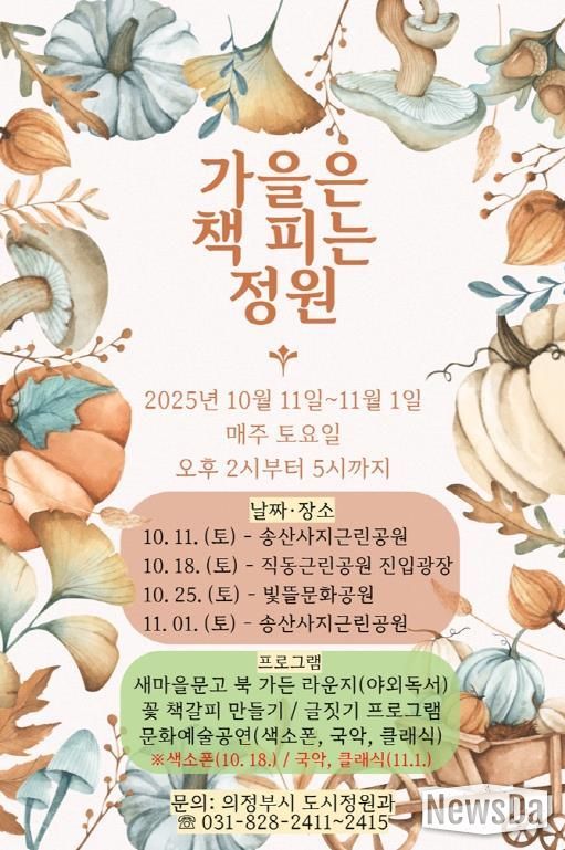 이와 함께 시는 10월 11일부터 11월 1일 매주 토요일 오후 2시부터 5시까지 총 4회에 걸쳐 송산사지 근린공원, 직동 진입광장, 빛뜰문화공원에서 ‘가을은 책피는 정원’ 행사를 순회 개최한다. 새마을 이동도서관과 협업해 도서 대여와 어린이 글짓기 교실을 열고, 지역 음악인들과 함께하는 클래식‧국악‧색소폰 공연, 꽃 책갈피 만들기 체험 프로그램도 진행할 예정이다.