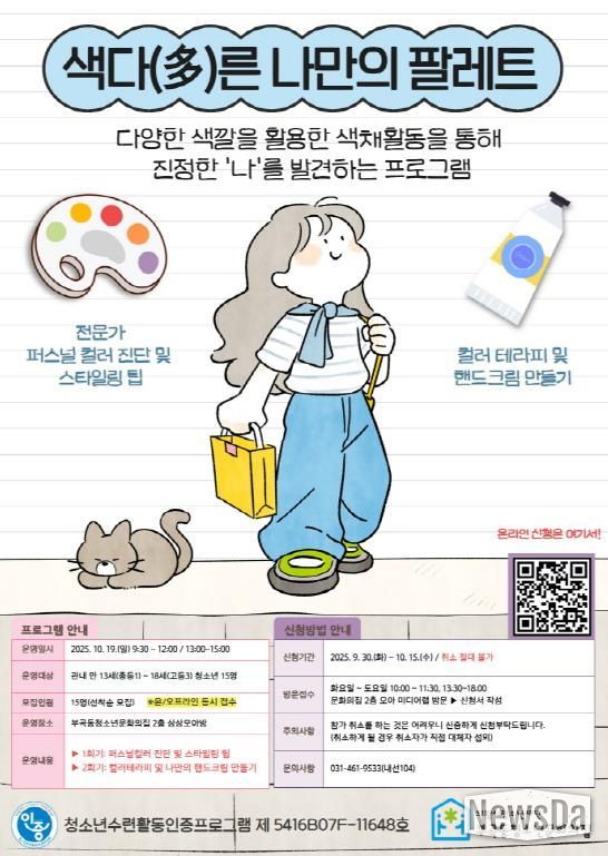 부곡동청소년문화의집 관계자는“이번 프로그램을 통해 청소년들은 다채로운 색채로 자신을 탐색하고 자존감을 높이는 의미 있는 시간을 갖게 될 것”이라며 “앞으로도 청소년 맞춤형 자기계발 프로그램을 적극 발굴하고 운영해 나가겠다”고 전했다.